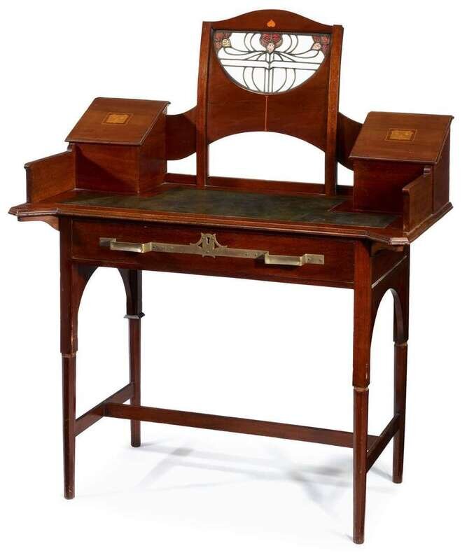 Arts and Crafts mahogany, inlaid and stained glass writing desk circa 1900, designed by g.m. ellwood, executed by j.s. henry