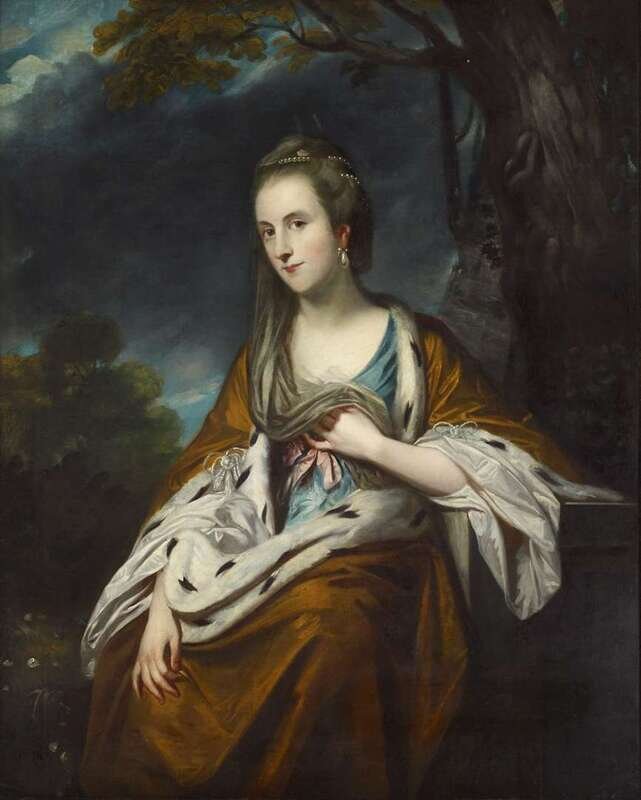 FOLLOWER OF SIR JOSHUA REYNOLDS (BRITISH 1723-1792) PORTRAIT OF A LADY WEARING SATIN GOWN, THREE-QUARTER LENGTH IN A LANDSCAPE