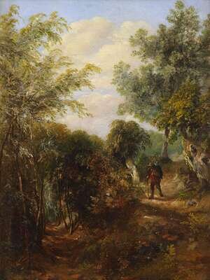 ATTRIBUTED TO PATRICK NASMYTH (SCOTTISH 1787-1831) TRAVELER IN A WOODLAND LANDSCAPE