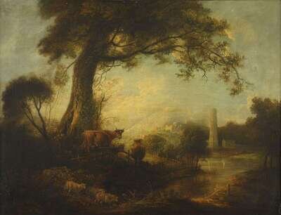 ELIAS MARTIN (SWEDISH 1739-1818) SHEEP AND COWS UNDER A GREAT TREE AT THE EDGE OF A STREAM