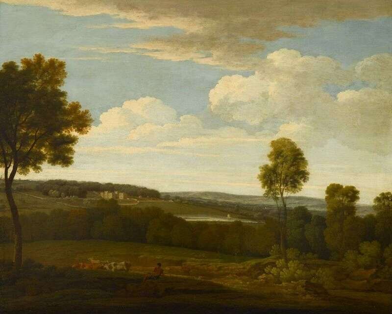 ATTRIBUTED TO RICHARD WILSON (BRITISH 1714-1782) ARCADIAN LANDSCAPE WITH SHEPHERD AND CATTLE, CASTLE BEYOND