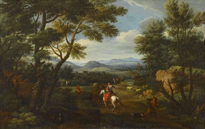 FOLLOWER OF JAN FRANS VAN BLOEMEN, L'ORIZZONTE (FLEMISH 1662-1749) TRAVELLERS IN A LANDSCAPE