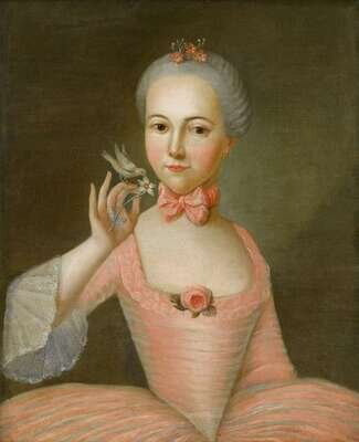 AUSTRIAN SCHOOL (18TH CENTURY) PORTRAIT OF A LADY IN PINK DRESS HOLDING BIRD AND FLOWER