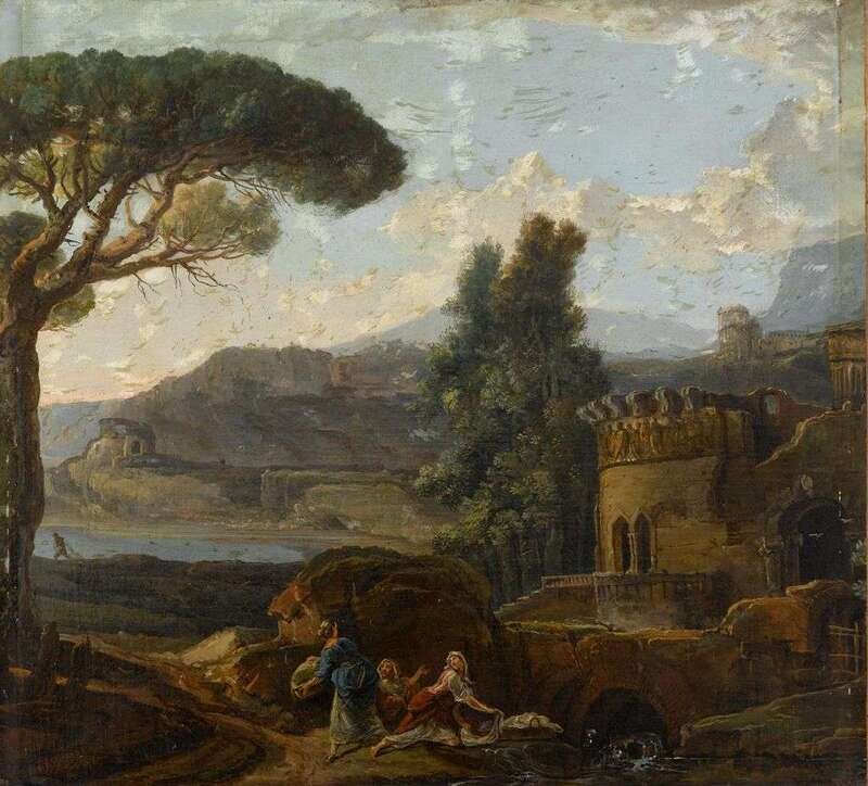HUBERT ROBERT (FRENCH 1733-1808) LAVANDIÈRES AT A STREAM, IN A CLASSICAL LANDSCAPE WITH RUINS