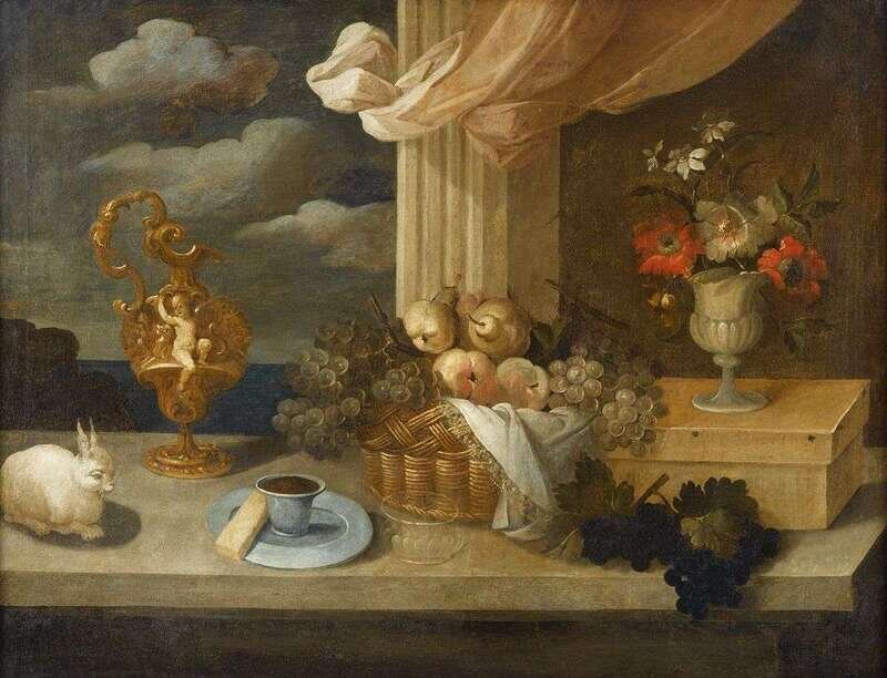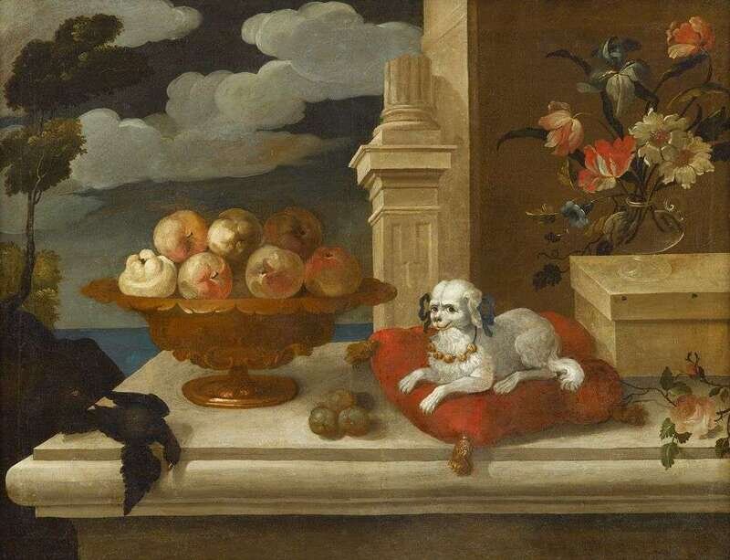 CIRCLE OF FRANCESCO FIERAVINO CALLED 'IL MALTESE' (ITALIAN CIRCA 1610-1670 ) STILL LIFE WITH SPANIEL ON A CUSHION, FRUIT IN A TAZZA, MIZED FLOWERS IN A VASE AND BIRD ON A LEDGEand;STILL LIFE WITH RABBIT, GILT BRONZE URN, MIXED FRUITS IN A BASKET AND CUP WITH A SAUCER ON A L...