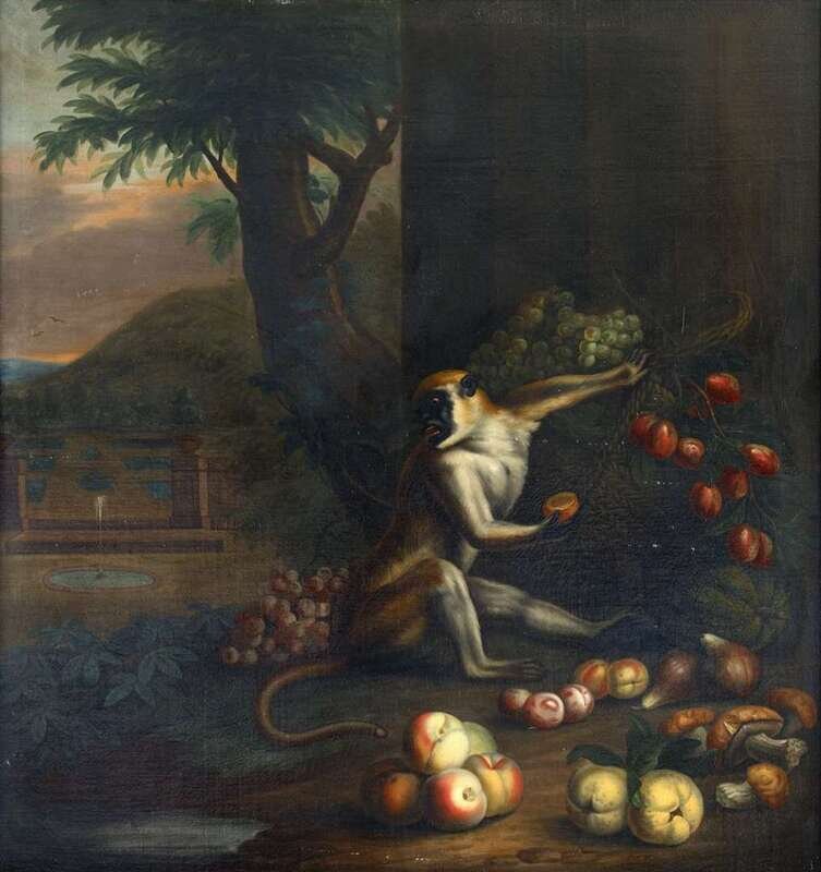 MANNER OF TOBIAS STRANOVIUS (GERMAN 1684-DIED AFTER 1724) MONKEY WITH OVERTURNED BASKET OF FRUIT, AND GARDENS WITH FOUNTAIN IN THE DISTANCE