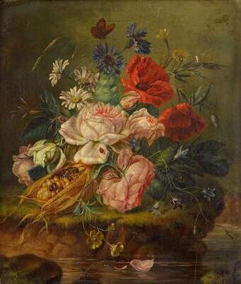 AMALIE KAERCHER (GERMAN ACT. 1860-1926) STILL LIFE OF MIXED FLOWERS AND INSECTS ON A MOSSY BANK