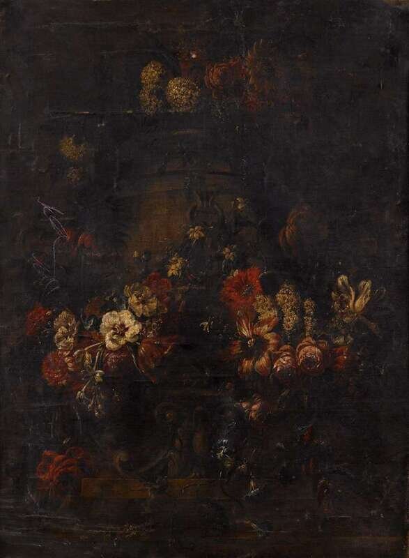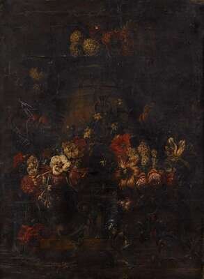 ATTRIBUTED TO GASPAR PIETER VERBRUGGEN THE YOUNGER (FLEMISH 1664-1730) FLORAL GARLANDS ADORNING AN URN UPON A LEDGE