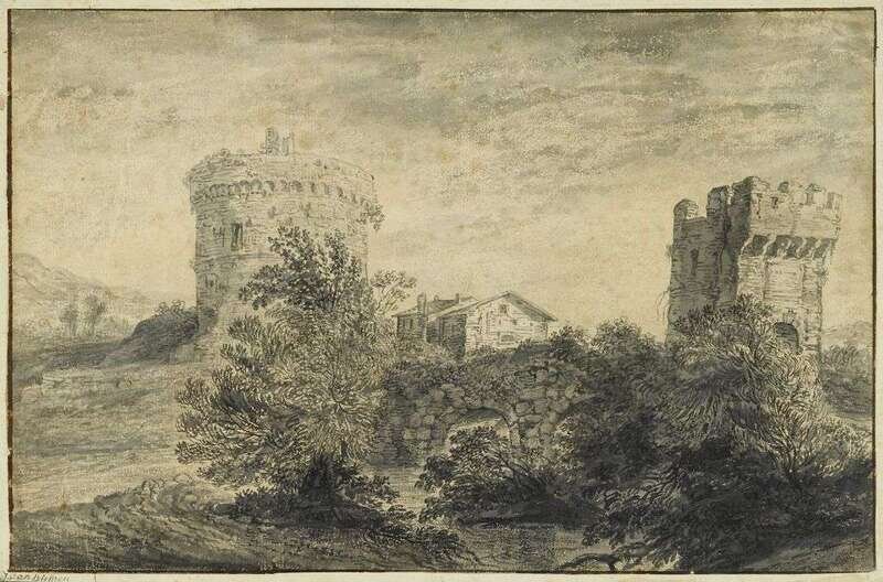 ATTRIBUTED TO JAN FRANS VAN BLOEMEN, L'ORIZZONTE (FLEMISH 1662-1749) ITALIANATE LANDSCAPE WITH STONE BRIDGE