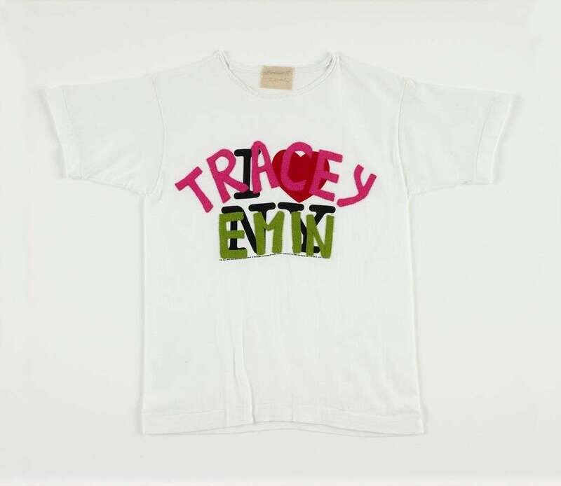 2002, signed, dated and inscribed '8' on t-shirt label, accompanied by cardboard tag with name, date and title. Screenprinted t-shirt with applique felt letters.