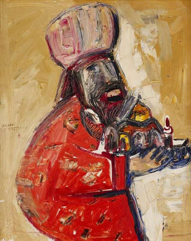 Signed and dated 1958 in Devanagari at center left and again verso, also signed 'BAKRE' at center left and 'S.K. Bakre' in ink verso, oil on masonite