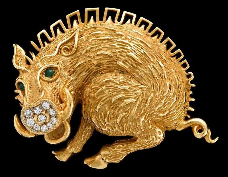 Playful 18 karat yellow gold diamond and emerald 'warthog' brooch