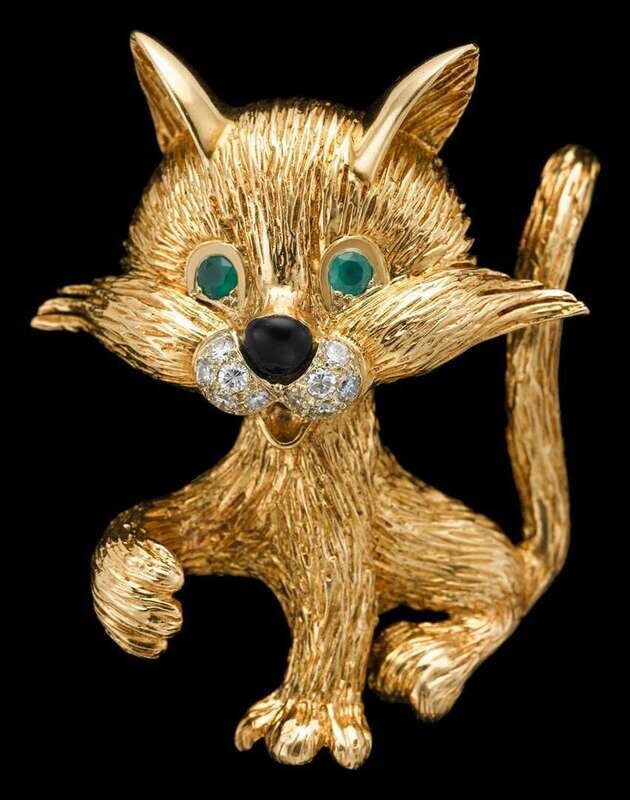 Whimsical 18 karat yellow gold emerald and diamond 'cat' brooch, Van Cleef & Arpels
