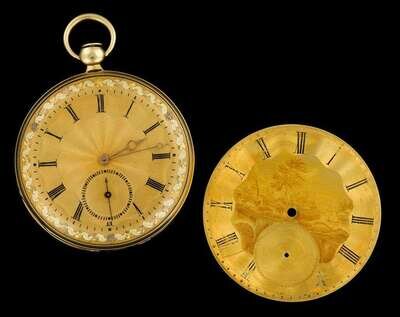 Circular open cased gold tone face displaying Roman numeral dial and subsidiary seconds dial, accented by floral detailing, cuvette signed by the maker and no. 3209, key wind movement signed by the maker. Accompanied by original box, keys, and an interchangeable watch face engraved with a riverside town scene.