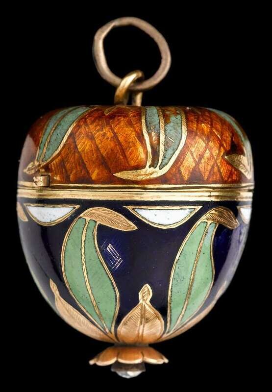 Charming 18 karat yellow gold, enamel and diamond 'pomme' pendant watch ca. 1880
