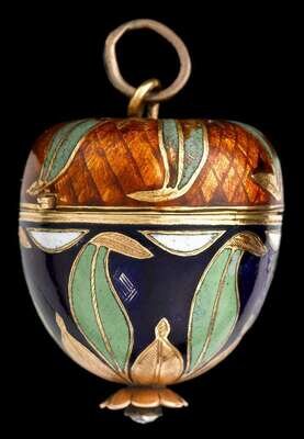 'Pomme' form watch, opens on hinge to display silver tone face displaying Roman numeral dial, key wind movement displaying no. 465. Outer case featuring orange, green, blue, and white enameling, accented by single petite rose cut diamond.