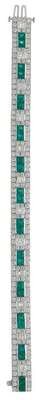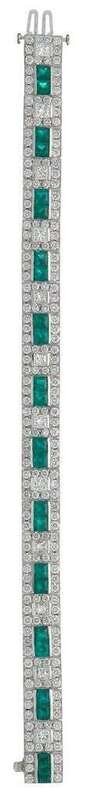 Each link displaying pave round cut diamond frame surrounding a single princess cut diamond or double princess cut emeralds. Total diamond weight approximately 10.8 carats.