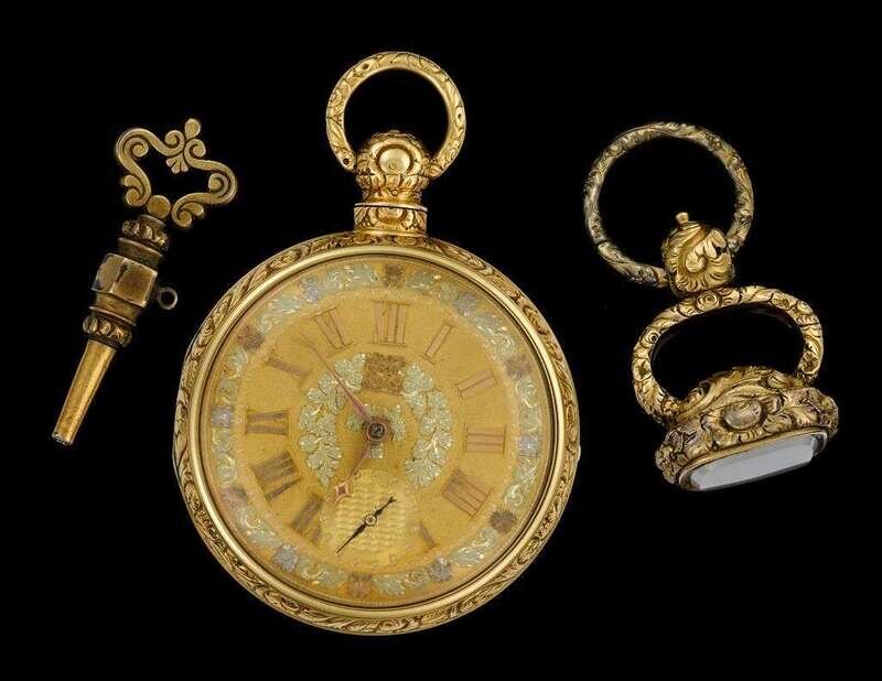 Circular double cased open face displaying Roman numeral dial and subsidiary seconds dial accented by multi color floral and wreath detailing, case no. 8867, key wind, outer case featuring foliate chasing. Accompanied by original key and fob.