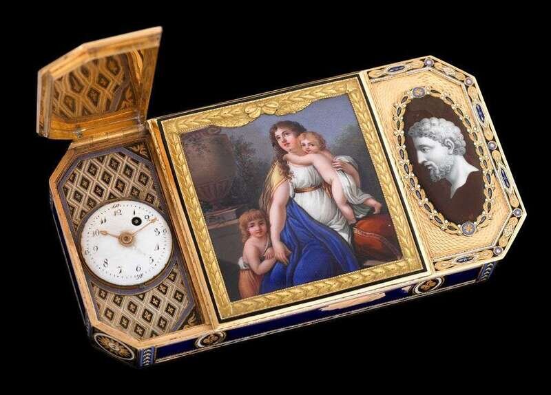 Modified rectangular form featuring a small manual key wind clock in inner compartment, two hinged lids depicting a classical seated female figure and two children flanked by the profiles of philosophers, each vignette framed by chased design accented by blue, black and white enameling, edges and underside with blue guilloche enamel. Accompanied by original key.
