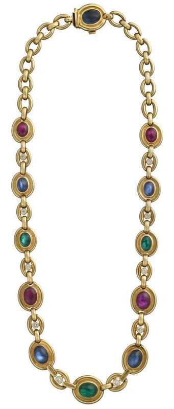 Alternating oval cabochon sapphire, ruby, and emerald accented links separated by smaller links featuring petite round diamonds, serial no. 91078.