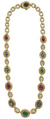 18 karat yellow gold, diamond, sapphire, ruby, and emerald neckchain