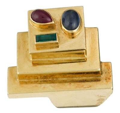 Geometric step form, upper level accented sapphire, ruby, and emerald, accompanied by pave diamond set insert, signed EK.