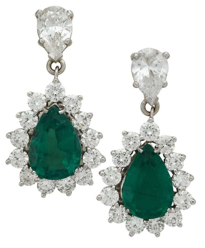Inverted pear shape diamond, each approximately 1 carat, followed by pear shape emerald in round cut diamond surround, pierced backings.