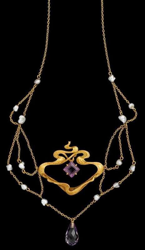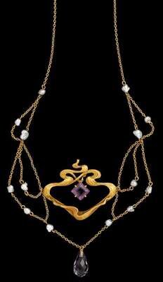 Art Nouveau 14 karat yellow gold, amethyst and seed pearl lariat pendant necklace