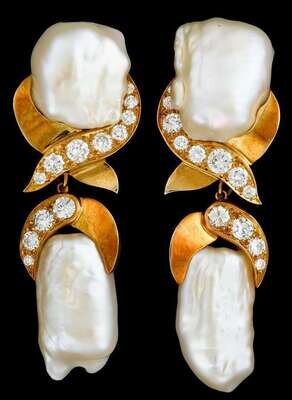 18 karat yellow gold, pearl and diamond earrings in the manner of paloma picasso