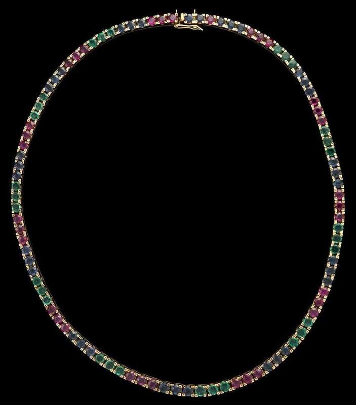 14 karat yellow gold sapphire, ruby and emerald line necklace