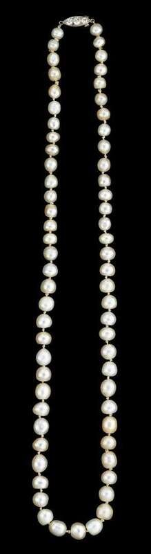 Graduated pearls, 5-6.5mm, platinum and diamond clasp.