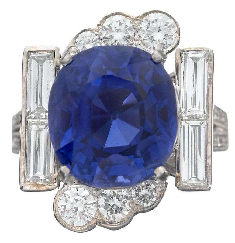 Approximately 11.8 carat cushion cut Ceylon sapphire prong set and framed by double baguette cut diamonds on either side and topped by graduated round cut diamond, pave diamond set shoulders.