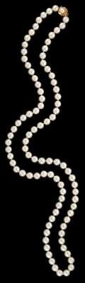 Single strand of opera length pearls, 9mm, featuring 14 karat yellow gold clasp.