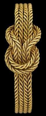 Circular cased petite yellow gold tone face with Roman numeral and dash dial, signed by the maker hidden under rope twist nautical knot cover on braided rope twist bracelet; mechanical movement.