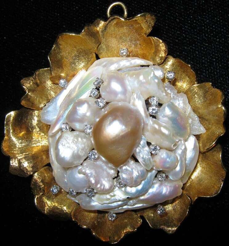 Blister pearl cluster brooch accented by petite round cut diamonds in 18 karat yellow gold petal frame, can be worn as a brooch or pendant.