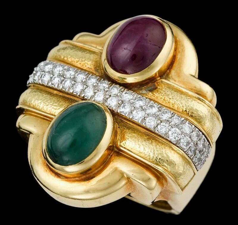 18 karat yellow gold, ruby, emerald and diamond ring, David Webb