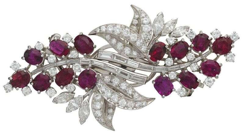 Vintage 14 karat white gold, ruby and diamond double clip brooch
