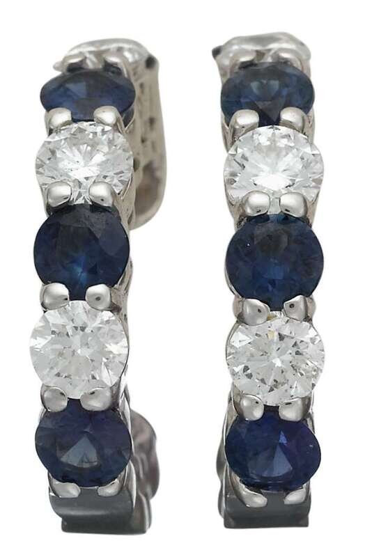 Alternating round cut sapphire and diamond earrings, total diamond weight approximately 1.2 carats, French post and omega backings.