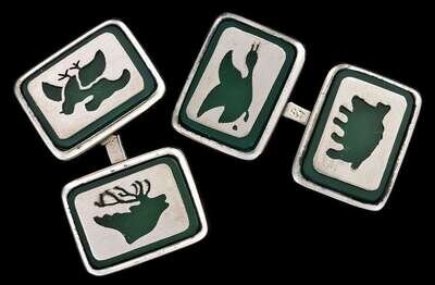 Featuring profiles of two birds, elk, and buffalo. Stamped with import hallmarks. Accompanied by original box.