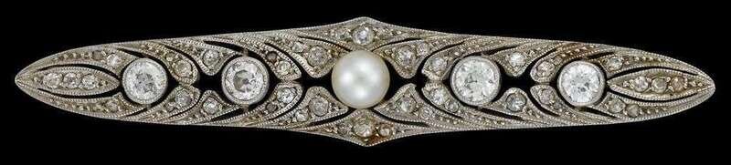 Modified navette form, centering on a single pearl accented by petite round cut diamonds in pierced scroll setting.