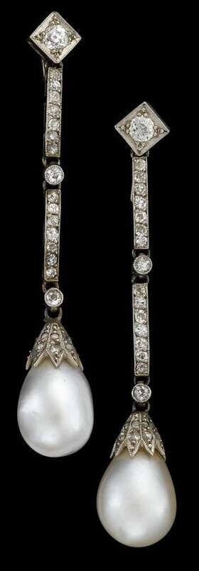 Rose cut diamond lines and bezel set diamonds finishing in a single natural drop pearl, 8mm.