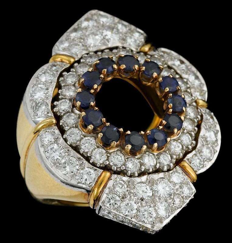 Comprised of two ring guards, one navette form accented by petite round diamonds, the other featuring petite round sapphires and diamonds.