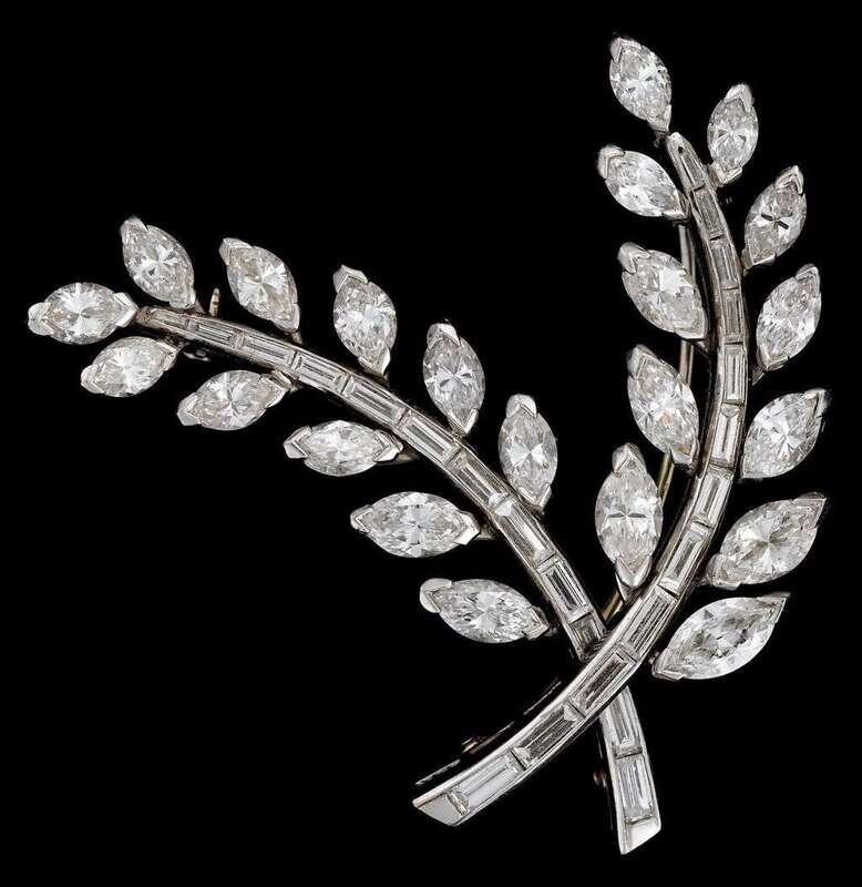 Unusual convertable 'wheat' brooches, marquise cut diamonds along graduated baguette cut diamond branch. Total diamond weight approximately 3.3 carats.