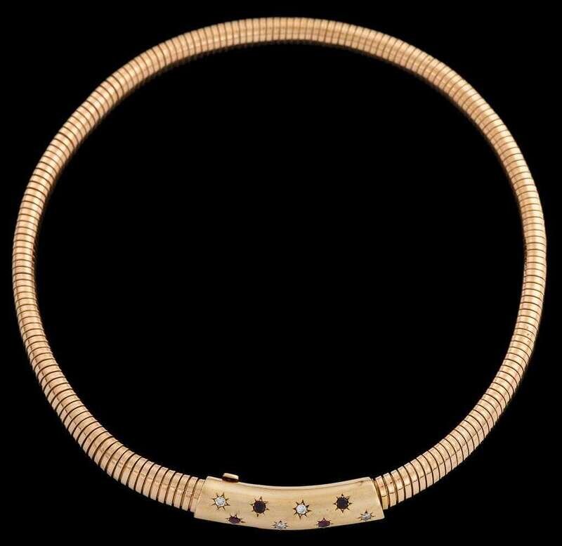 Retro 14 karat yellow gold ruby and diamond collar necklace