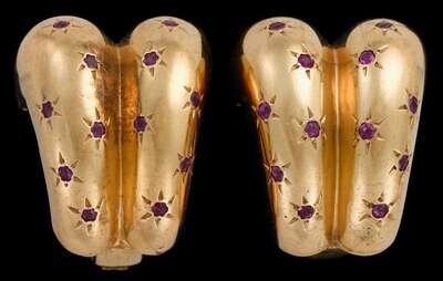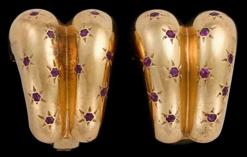 Double half hoops featuring petite round rubies in 'star' settings, clip backings.