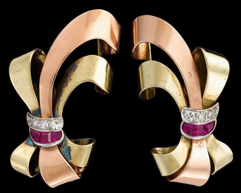 Retro 14 karat yellow and rose gold ruby and diamond earrings, Tiffany & Co.
