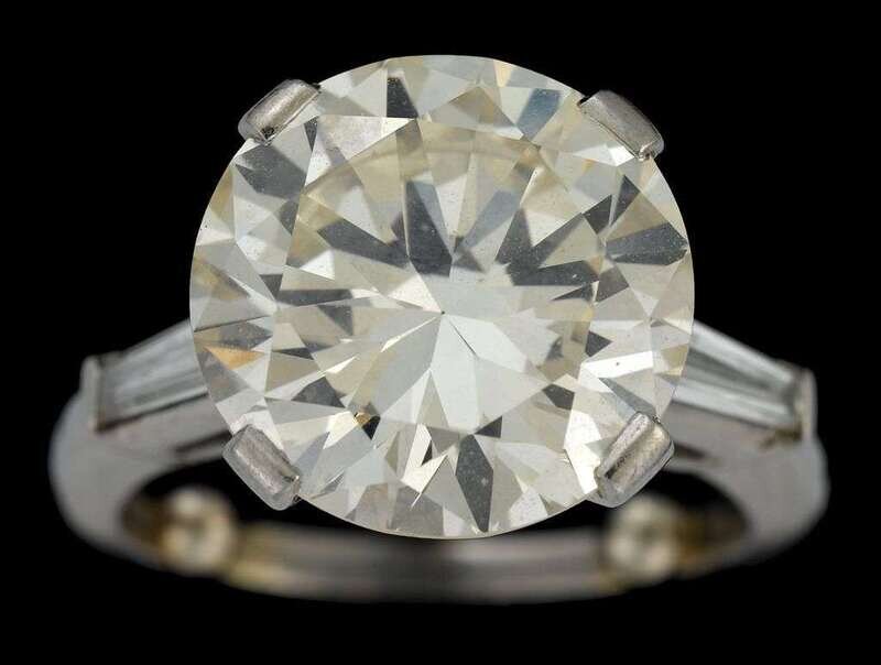 Classic single round cut diamond, approximately 7 carats, framed on either side by a tapered baguette cut diamond.