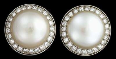 Removable white South Sea pearl, 18mm, pave diamond set channel surround, omega clip backing.