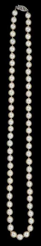 Slightly graduated, 6-6.5mm, 14 karat white gold clasp.