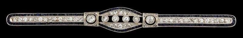 Art Deco platinum topped yellow gold, diamond and sapphire bar brooch
